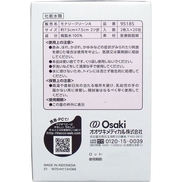 クリーンコットン モナリー ノンアルコール 約7.5cm×7.5cm 2ツ折 2枚入×20包入商品区分:化粧品●水だけのピュアなやさしさ!精製水100%含浸、便利な2枚入・単包滅菌済ウエットコットンです。