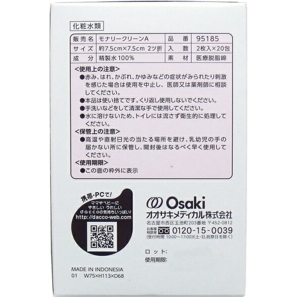 クリーンコットン モナリー ノンアルコール 約7.5cm×7.5cm 2ツ折 2枚入×40包入クリーンコットン モナリー ノンアルコール 約7.5cm×7.5cm 2ツ折【クリーンコットン モナリー ノンアルコール 約7.5cm×7.5cm 2ツ折 2枚入×20包入】広告文責(有)イースクエアTEL:0120-532-772オオサキメディカル株式会社個装サイズ:75X113X68mm個装重量:約225g内容量:2枚入×20包製造国:インドネシア【発売元:オオサキメディカル】【素材】医療脱脂綿【成分】精製水・・・100%【入数】2ツ折2枚入×20包【サイズ】7.5cm×7.5cm【注意事項】・赤み、はれ、かぶれ、かゆみ等の症状が見られたり、刺激を感じた場合は使用を中止し、医師または薬剤師にご相談下さい。